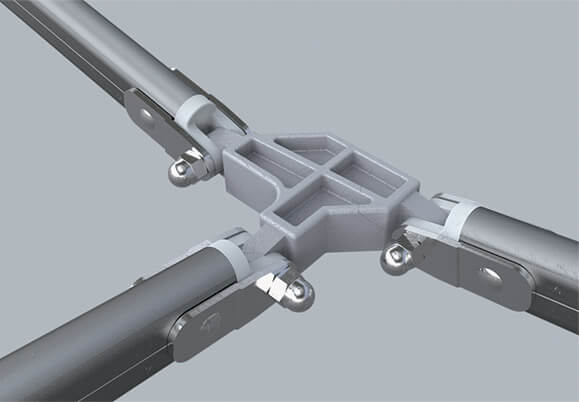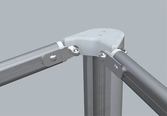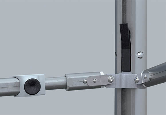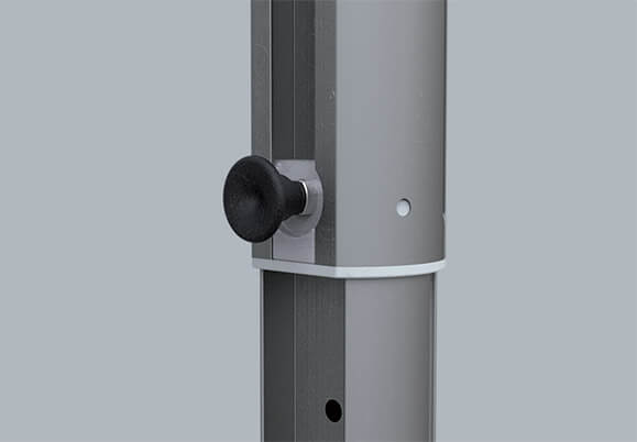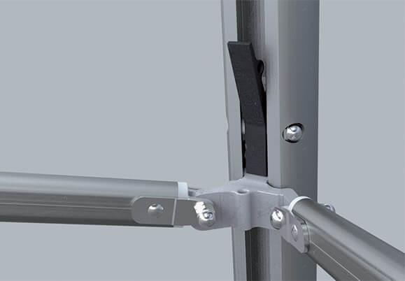 Robuste et esthétique, il est constitué d’une structure à toit plat inclinable, grâce à des croisillons télescopiques. Ses pieds sont équipés de vérins à gaz assurant une assistance au déploiement. Un système unique et breveté qui vous accompagnera quotidiennement !